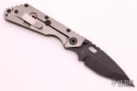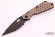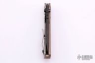 This Duane Dwyer Custom SMF features a black tanto blade with a chisel grind. The handle has a light orange peel finished titanium frame and front frame of tan aluminum.  Titanium clip, tip up carry. Notches on thumb-rest, rear of handle, and lockup. Includes Hinderer "Lock Bar Stabilizer" for maximum reverse lock retention. Has a few light scratches on the frame, has some rust spots on the blade, otherwise good condition.
