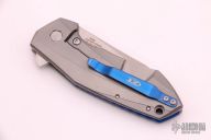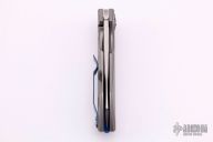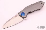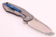 This ZT 0456 by Zero Tolerance features a satin finished clip point blade with swedge and flipper. The handle has a machined titanium frame over an anodized aluminum backspacer. Lanyard hole in pommel and after market machined titanium clip is positioned for tip up carry. Includes original box and paperwork. Excellent condition. #10629.