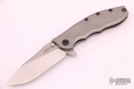 This Hinderer Designed 0562 Framelock Flipper has a drop/ spear point blade with swedge, notched thumb rest, dual thumb studs and flipper. Handle has a stonewashed titanium frame with stainless steel lockbar insert and lockbar stabilizer. Stainless steel clip is tip up. Includes original box and papers. Excellent condition. #0111