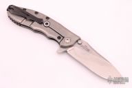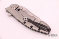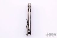 This Hinderer Designed 0562 Framelock Flipper has a drop/ spear point blade with swedge, notched thumb rest, dual thumb studs and flipper. Handle has a black G10 and stonewashed titanium - with stainless steel lockbar insert and lockbar stabilizer. Stainless steel clip is tip up. Includes original box and papers. Excellent condition. #20825