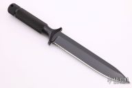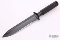 This Project 1 Fixed Blade by Chris Reeve has a non-reflective Kalgard coated A2 stainless steel spear point partially serrated blade, .264" blade stock, 1.244" depth. Handle and blade are both made from a single block of steel. Handle is knurled with double guard and removable butt cap with lanyard hole. Excellent condition. #244 Made in USA. Comes with COA dated August 14, 1992.