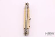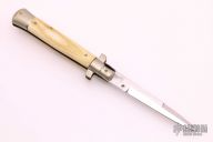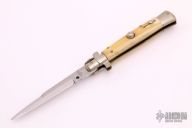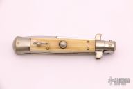 This pick lock auto by Latama is an early and unusual variation. It features a mirror polished bayonet ground blade with a false top edge. Very early lock hole drilled completely through the blade. The handle has nickel silver guard and rear bolster and honey horn scales, "D stamped" brass liners, polished stainless steel backspacer with large round lock tab with a nice taper. Has nickel silver button and safety. Kick spring is the early dovetailed type, has nice function, strong firing. Has some blade play in the open position. Has some minor patina and some light scratches, otherwise excellent condition.