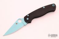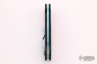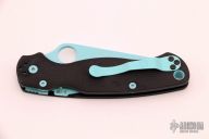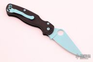 This Para 2 by Spyderco features a clip point blade with thumbhole and notched thumbrest. The handle is comprised of black G-10 frame over nested steel liner and stand-offs. The steel pocket clip is 4 way adjustable. Includes original box and paperwork. Excellent condition. Custom Tiffany Blue cerakoted blade, liners, clip and hardware.