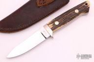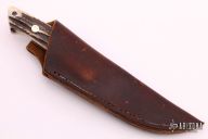 This Loveless Style Semi-Skinner by WC Davis features a mirror polished drop point blade, nickel silver fittings, and stag scales with red liners, .190" blade thickness and .958" blade depth, full tapered tang. Comes with a brown leather sheath. Excellent condition.