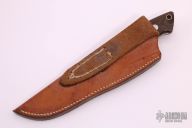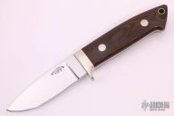 This Loveless Style drop point hunter by WC Davis features a mirror polished drop point blade with notched thumbrest, nickel silver fittings, and black canvas micarta scales with red liners. .177" blade thickness and 1.019" blade depth, full tapered tang. Comes with a brown leather sheath. Excellent condition.