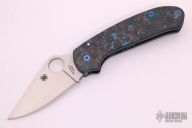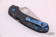 This Para 3 by Spyderco features a satin finished clip point blade with thumb hole and notched thumbrest. CPM Cruwear Blade Steel. The handle is comprised of custom fat carbon scales over nested steel liner and stand-offs. The steel pocket clip is 4 way adjustable. Includes original box and paperwork. Excellent condition.