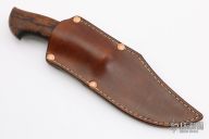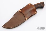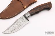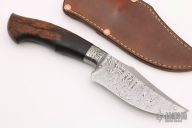 This Knife by Jan Hafinec features a clip point Damascus blade with a sharpened top edge, .175" blade stock and 1.738" blade depth, hidden tang construction. The handle has an integral Damascus guard with a nicely sculpted ironwood burl grip. Comes with a brown leather sheath. New from maker.