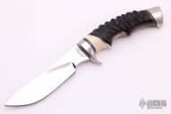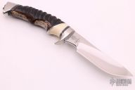 This Skinner by Ruffin Johnson features a mirror polish blade with .169" blade stock, .941" blade depth, hidden tang construction. The handle has a mirror polished stainless steel guard and butt, impala horn grip with black/white/ivory/aluminum spacers. Excellent fit and finish. Wolf logo onset on butt. Excellent condition.