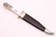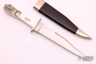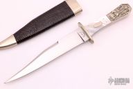 This Bowie By Ron Frazier features a hand rub satin finished clip point blade with false top edge, .185" blade stock and 1.130" blade depth, full tang construction. The handle has a nickel silver guard, mother of pearl and carved nickel silver scales, nickel silver escutcheons. Comes with a nickel silver and black leather scabbard. Has a few light scratches, otherwise excellent condition.