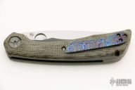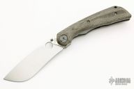 This knife features a satin finished drop point blade with a deep belly.  The handle features micarta scales over bead blasted liners, green micarta backspacer and a zircuti tip up pocket clip.  Includes a padded zippered case.  Excellent Condition.