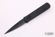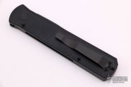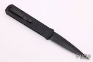 This knife features a black blade with notched thumbrest. The handle has a black aluminum frame with black hardware and black stainless steel tip up clip.  There is a lantern inlaid into the push button.  Comes with original box and papers. New from maker.