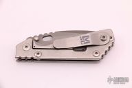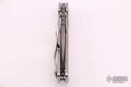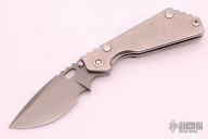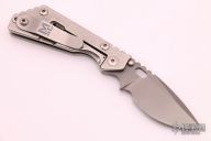 This PT framelock folder by Mick Strider features a black wide belly blade with notched thumbrest and a thumbhole. The handle has a tumble finished titanium frame with matching tip up titanium clip. Nice detent, lockup and blade seating. Has some scratches on the clip, otherwise excellent condition.