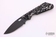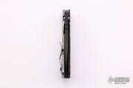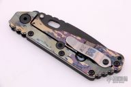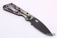 This SMF by Mick Strider features a black blade with notched thumbrest and thumbhole. The handle has a aluminum and titanium frame, with tip up titanium clip. Handle finish is "A-Tacs Camo". Nice detent, lockup and blade seating. Excellent condition.