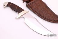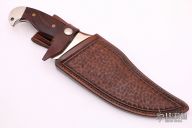 This Bowie by Randy Lee features a mirror polished blade with false top edge and fileworked spine, .227" blade stock and 2.582" blade depth, full tapered tang construction. The handle has dovetailed nickel silver bolsters, desert ironwood scales with mosaic pins and a lanyard hole at the butt. Comes with a hand tooled brown leather sheath. Excellent condition.