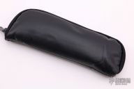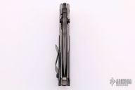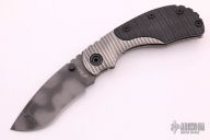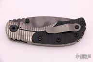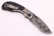 This RCC framelock by Mick Strider features a nightmare grind recurve blade with notched thumbrest and dual thumbstuds. The handle has a titanium frame with black G-10 scales, tumbled titanium backspacer and tip up titanium clip. Nice detent, lockup and blade seating. Comes with a zippered case. Excellent condition.