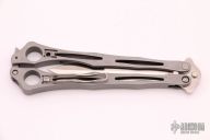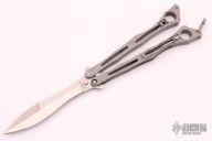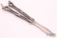 This Spyderfly Balisong by Spyderco features a satin finished spear point blade with a false top edge. The handles are bead blasted stainless steel with a tip up clip (4-way reversible). Includes original box. Excellent condition.