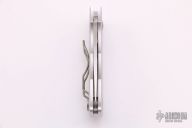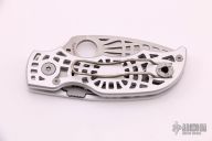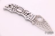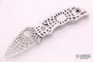 This "S" by Spyderco features a satin finished skeletonized blade with notched thumb and finger rests. The handle has a silver aluminum frame with a single stainless steel liner, tip up stainless steel clip. Comes with original box. Excellent condition.