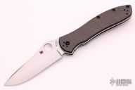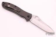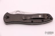 This Bradley2 liner lock folder by Spyderco features a satin finish blade with thumb hole. Carbon fiber pattern G-10 scales, polished stainless steel liners, and black coated stainless steel pocket clip, tip up carry, 4 way reversible. Strong lock up, nice detent and blade seating is center. Excellent condition. Comes with original box and papers.