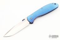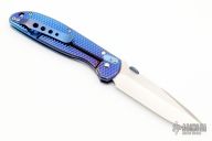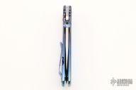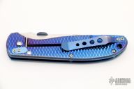This Custom Firetac by Rick Hinderer features a satin finished drop point blade with swedge, anodized titanium thumb disc and notched thumb ramp. The handle is comprised of a textured titanium frame over titanium barrel spacers. Anodized titanium clip is reversible for tip up or tip down carry with matching filler tab. Lanyard hole in pommel. Includes nylon zippered case. Some minor carry marks on pocket clip but otherwise excellent condition.