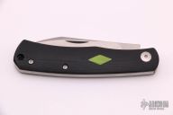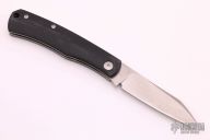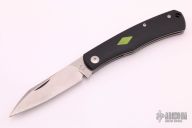 This Birdy Slipjoint by Sacha Thiel features a tumble finished blade with nail nick. The handle has black G-10 covers with green G-10 escutcheon, titanium liners and a stainless steel spring. Has half stop, flush in all positions. Comes with original box, papers and leather slip sheath. Excellent condition.