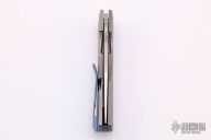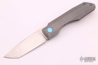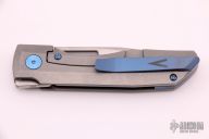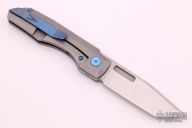 This Impulse Mini by Vero Engineering features a belt satin finished blade with notched thumbrest and flipper. The handle has a tumbled titanium frame with blue titanium hardware, tip up clip with hidden screws and backspacer. Nice detent, lockup and blade seating. Comes with a zippered case and COA dated 1-6-21. Excellent condition. #022