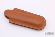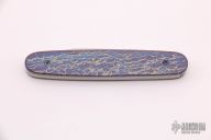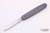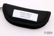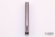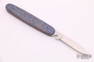 This Mystery Knife by Mike Vagnino features a hand rub satin finished blade. The handle has anodized titanium covers with stainless steel liners and spring. Comes with a leather slip sheath and a zippered case. Has a couple light scratches, otherwise excellent condition. INSTRUCTIONS: Open: hold vertically with pivot end down, press blade & release, then pinch blade open. Close: Fold closed, hold vertically pivot end up, depress blade to lock.