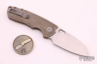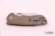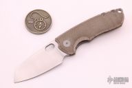 This F5.5 by Urban EDC Supply is a Vox Design. It features a satin finished blade with thumbhole and notched thumbrest. The handle has canvas micarta scales, blasted titanium liner, backspacer and tip up clip. Rides on bearings, nice detent, lockup and blade seating. Comes with challenge coin #694. Excellent condition.