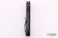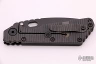 This Mick Strider SMF Fatty framelock folder features a black blade with thumbhole and notched thumbrest. The handle has a black aluminum and flamed titanium frame with titanium clip, tip up carry. Jimping on blade spine. Nice lockup, detent, and blade seating. Excellent condition. Has FWP on the front scale.