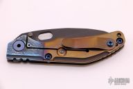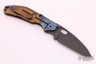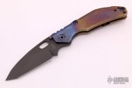 This DCG BBNM Framelock Folder has a MilSpec Black Oxide finished tanto V-ground blade with dual thumbstuds and thumbhole. Handle has a Molten bolster, two-tone gold to blue titanium frame, titanium tip up clip, and titanium barrel spacers, custom colored hardware. Centered blade and great lockup and detent with zero blade play. Comes with zippered case and COA. Excellent condition. CPM REX 76 blade steel.