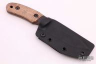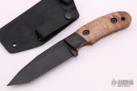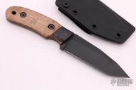 This RM by Duane Dwyer features a MilSpec Black Oxide tanto blade with .161" blade stock and 1.277" blade depth, full tang construction with Quilted Maple scales that have inlaid "Photo Luminescent" carbon fiber bolsters. Comes with a kydex sheath, COA and original packaging. Excellent condition. CPM Rex M4 Blade Steel