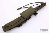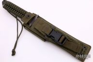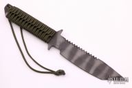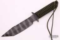 The BN-SS by Strider features a tiger stripe DUB tanto blade with a serrated top edge .248" blade stock and 1.490" blade depth, full tang construction. The handle has a green paracord wrapped handle. Comes with a green nylon sheath. Excellent condition.