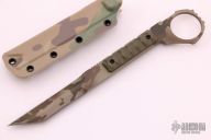 This is our special edition Ikken Hissatsu in "Camo" that is fitted with textured green G-10 scales and specialized camo Cerakote Finish by C&B Quality Coatings based in Savannah, GA. A specialized ambidextrous sheath created by Dauntless Manufacturing accompanies each blade.