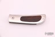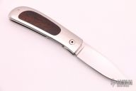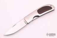 This knife by Michael Walker features a hand rub satin finished blade with nail nick. The handle has a stainless steel frame with desert ironwood inlays, stainless steel liners. Nice lockup and blade seating. Has some light scratches, has been sharpened, otherwise good condition.