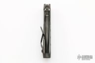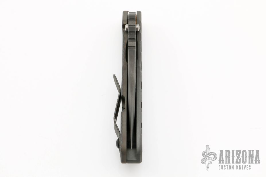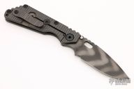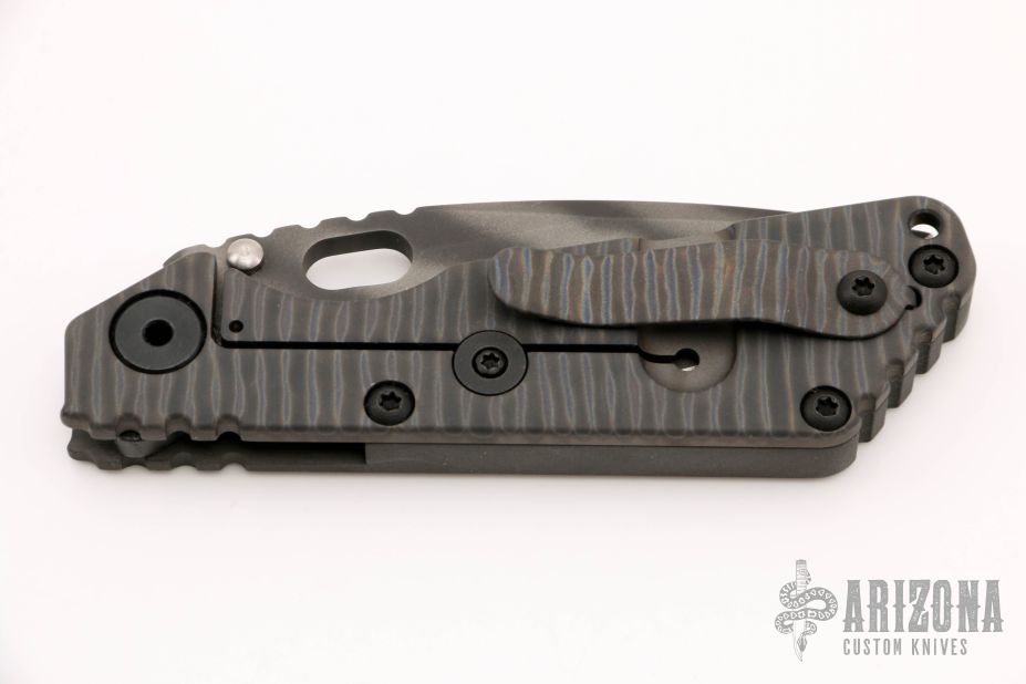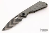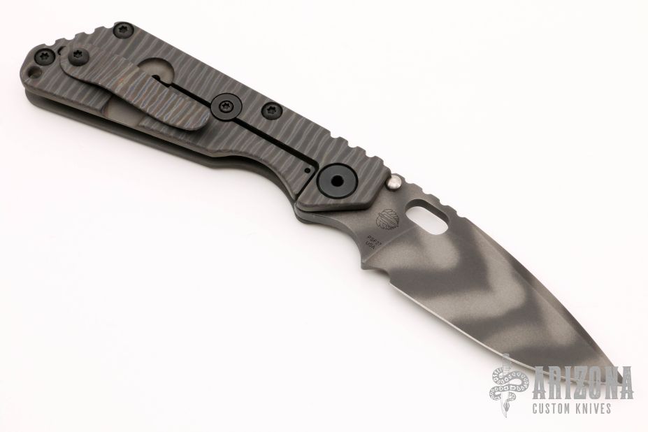 This SNG framelock folder by Mick Strider features a tiger stripe spear point blade and a chevron pattern grey aluminum and flamed titanium frame and tip up titanium clip. Includes a "Lock Bar Stabilizer" for maximum reverse lock retention. Nice detent, lockup and blade seating. New condition. 1 of 2