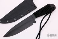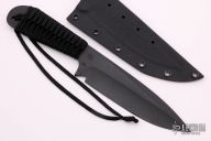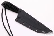 This Fighter from Mick Strider features a black coated blade with a nice deep swedge and false top edge. The blade stock is .214" with a blade depth of 1.684". This beast has a cord wrapped handle and a black kydex sheath. New condition.