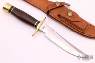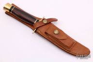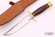 This Model C hunter by Ralph Bone features an upswept satin finished blade with .179" blade stock and 1.094" blade depth, hidden tang construction. The handle has a brass guard and butt, cocobolo grip and black/brass spacers. Has "C" stamp. Excellent condition. #283 on blade. Comes with a brown leather sheath.