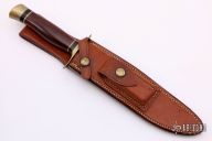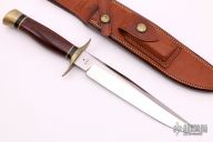 This Model A Fighter by Ralph Bone features a satin finished clip point blade with a sharpened top edge, .242" blade stock and 1.175" blade depth, hidden tang construction. The handle has a brass double guard and brass butt cap, cocobolo grip with black and brass spacers. Has some very light scratches, otherwise excellent condition. Comes with a brown leather sheath. Stamped A490
