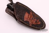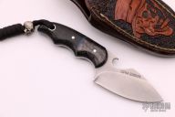 This knife by Marshall Hall features a bead blasted blade with bottle opener on top, .123" blade stock and 1.231" blade depth, full tapered tang construction. The handle has dovetailed carbon fiber bolsters, black canvas micarta scales, blue liners and spacers. Comes with a hand tooled brown leather sheath. Excellent condition.