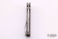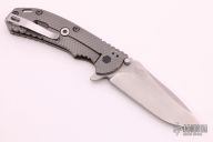 This Hinderer Designed 0561 Framelock Flipper has a stonewashed drop/ spear point blade with swedge, notched thumb rest, dual thumb studs and flipper. Handle is G10 and stonewashed titanium - with stainless steel lockbar insert and lockbar stabilizer. Stainless steel clip is tip up. Dead center blade seating, flips like a champ, and has rock solid lockup. Extremely well-made piece, #0131. Comes with original box and papers. Scratches on the clip, and some wear on the hardware. Good condition.
