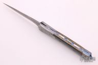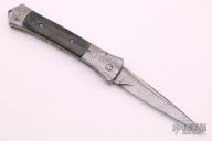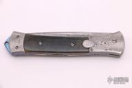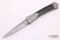 This Auto by Jason Williams features a Damascus blade with false top edge and fullers. The handle has matching carved Damascus bolsters and push button, fileworked screws, green mammoth ivory scales, anodized and fileworked titanium liners and backspacer with black lip pearl inlays, mammoth ivory blade stop. Nice lockup, action and blade seating. Comes with a zippered case.