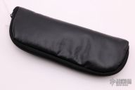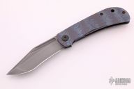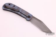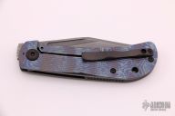 This Rebel Framelock Front Flipper from Jim Burke has a hand rub satin finished and acid washed recurve blade with swedge, fullers and notched thumbrest/front flipper. The handle is comprised of a Cobalt Ice Finished MokuTi frame, black titanium hardware, backspacer and tip up clip with finger grooves, lanyard hole at the butt. Rides on bearings, nice detent, lockup and blade seating. The handle is nicely contoured with a beautiful palm swell. Excellent condition. Comes with a zippered case.