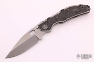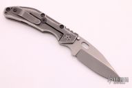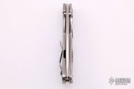 The Frame: Ultralight magnesium presentation side scale with diamond plate texture! The magnesium has been finished with a weathered dark grey/black finish, periodic table markings and has a light texture to it to add extra grip. Titanium liner under magnesium for additional stabilizing and frame reinforcement. Titanium lock side has matte blasted natural Ti finish weathered to match the magnesium, with subtle radial engraved texture. In addition to being light, the Magnesium side can be used as a fire starter, adding some extra function to the knife. Both sides have been ball milled giving both increased grip and looks that kill. Black frame hardware with two tone natural '458' pivot