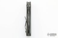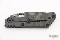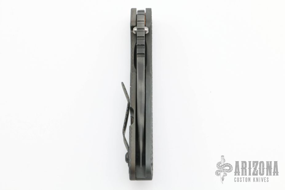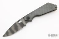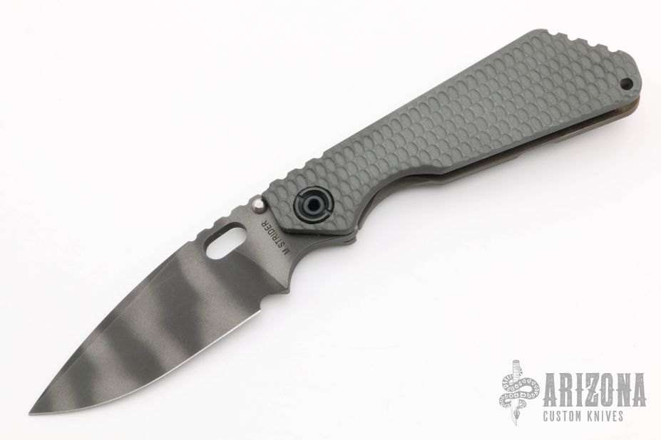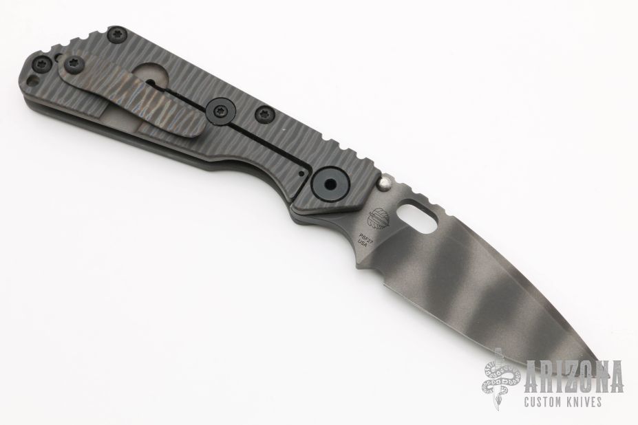 This SNG framelock folder by Mick Strider features a tiger stripe spear point blade and a dimple pattern grey aluminum and flamed titanium frame and tip up titanium clip. Includes a "Lock Bar Stabilizer" for maximum reverse lock retention. Nice detent, lockup and blade seating. New condition.