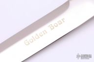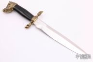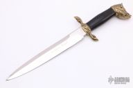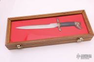 This collector's knife from Kershaw is #4523 of 5000 made in Solingen, Germany. Features mirror polish blade with false top edge and "Golden Bear" engraving. Blade is .256" thick and 1.251" deep. Brass guard and pommel feature heads of a bear. Comes with display case. Excellent condition.