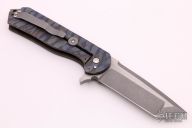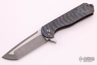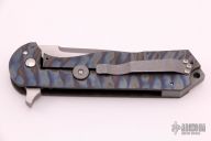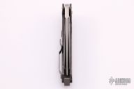 This Rhino Bull Flipper by Melvin Lozada features a two-tone compound ground tanto blade with swedge and flipper crafted from .265" blade stock. The handle is comprised of a textured and flame finished titanium frame over a tumbled stainless steel backspacer and tip up clip. Great blade seating, detent and lock up and fires open with authority on bearings. Excellent condition. Comes with a zippered case.