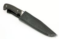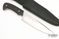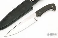 This knife by Jim Ferguson features a polished blade with .224" blade stock and 1.856" blade depth, full tang construction with black linen micarta scales. Comes with a hand tooled black leather sheath and zippered case. The sheath is not original, but it does fit nicely. Has some light scratches, otherwise excellent condition.