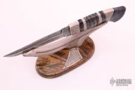 This "Blue" by P-O Eklund features a Roger Bergh Damascus blade with false top edge, .155" blade stock and 1.050" blade depth, hidden tang construction. The handle is made from reindeer antler, Roger Bergh Damascus fluted spacer and butt, and stabilized and coloured birch masur, pewter spacers, has traditional horn engraving done by the maker. Comes with a matching reindeer antler and stabilized and sallow root stand. Comes with COA dated 11-15-20. New from maker.