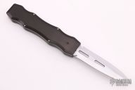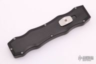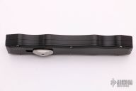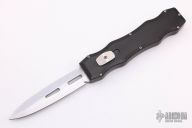 This Sand Shark OTF automatic features a silver finished double edge blade and black aluminum handle. The Sand Shark was a limited production and is no longer being made. Comes with original box, warranty card and cloth pouch. Excellent condition. #44 under thumbslide is visible in the open position.