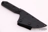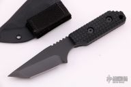 This Dub by Strider Knives features a black coated tanto style blade with notched thumbrest, .199" blade stock and 1.301" blade depth, full tang construction. The handle is comprised of black G-10 scales with milled frag pattern. Lanyard hole in pommel. Includes kydex sheath. Has some scratches on the blade, otherwise excellent condition. This knife is sterile with no markings.