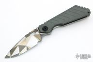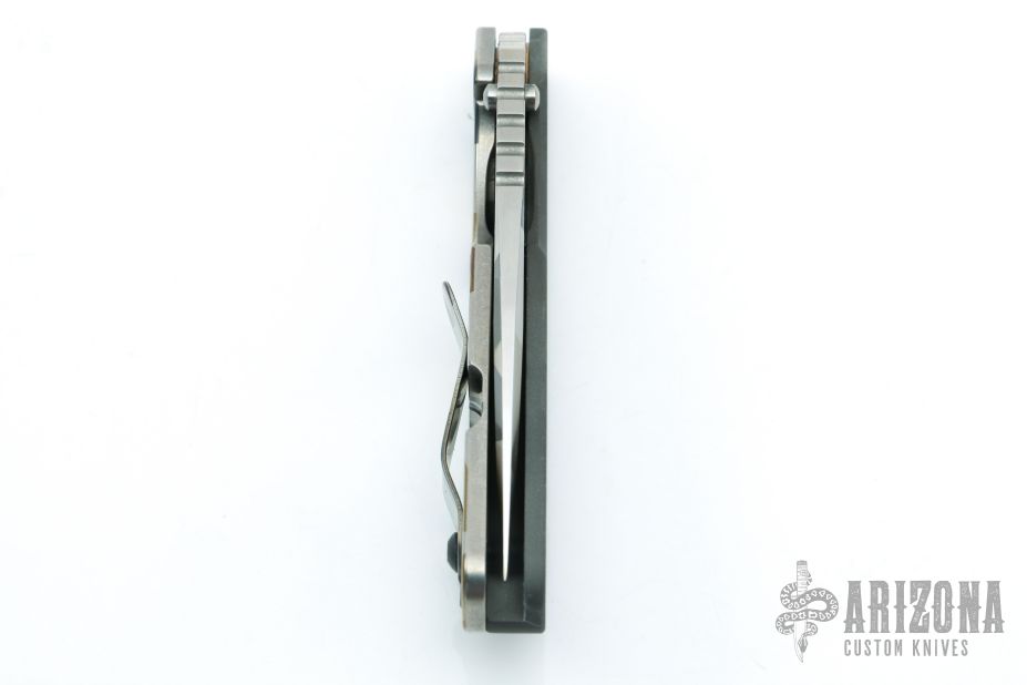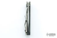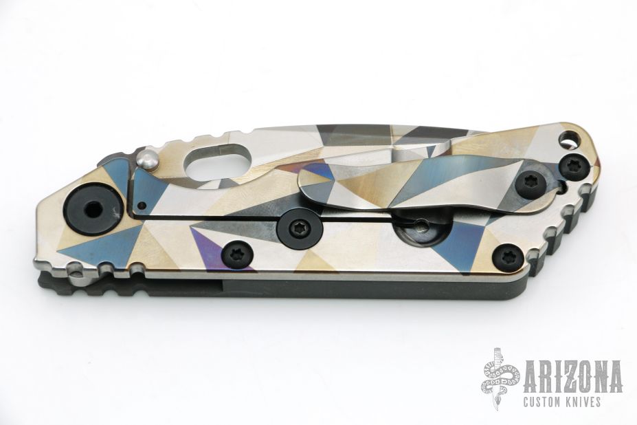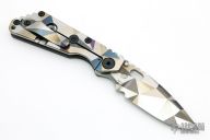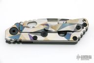 This SNG framelock folder by Mick Strider features a Battleship Camo spear point blade and a grey aluminum and Battleship Camo titanium frame and tip up titanium clip. Includes a "Lock Bar Stabilizer" for maximum reverse lock retention. Nice detent, lockup and blade seating. New condition.